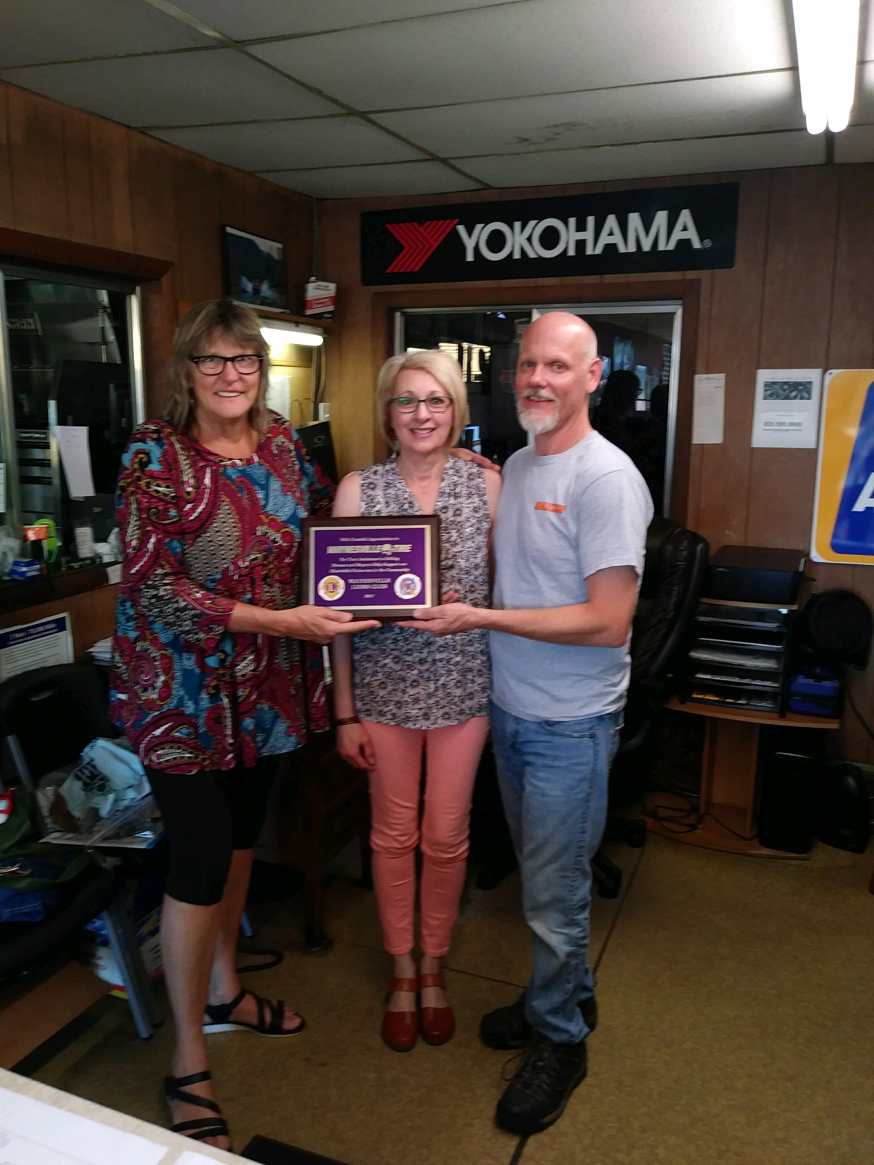 Waynesville Tire Company receiving their plaque from Lion Suzann Lanning of the Waynesville Lion's Club. In appreciation of their support of our club, by selling our brooms and mops, at their store.